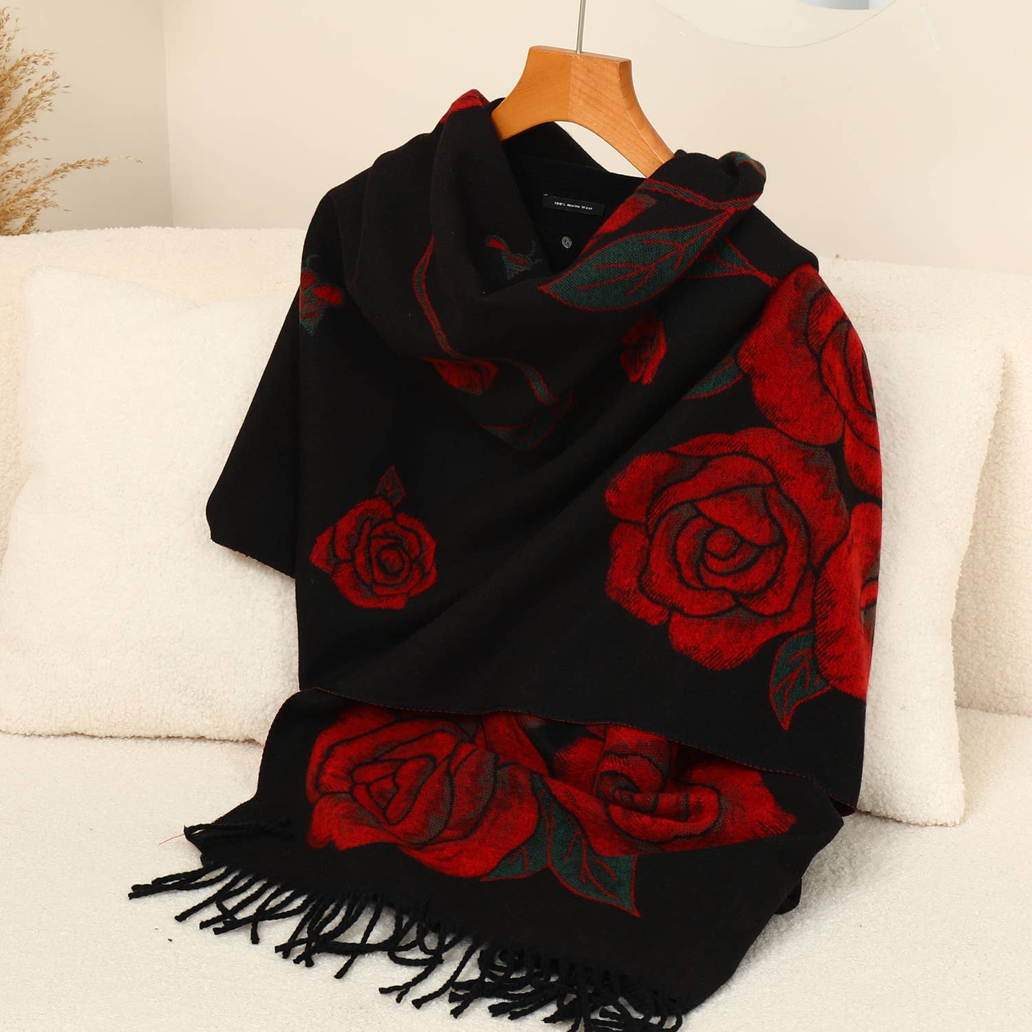 Indulge in the luxury of this exquisite scarf, adorned with a sophisticated floral pattern. Each rose is intricately detailed, offering a timeless elegance to your wardrobe. The scarf’s generous dimensions provide ample warmth and versatility, while the delicate fringe adds a touch of classic charm. Perfect for elevating any outfit, this scarf is not only a statement of fashion but also a testament to enduring style and quality.