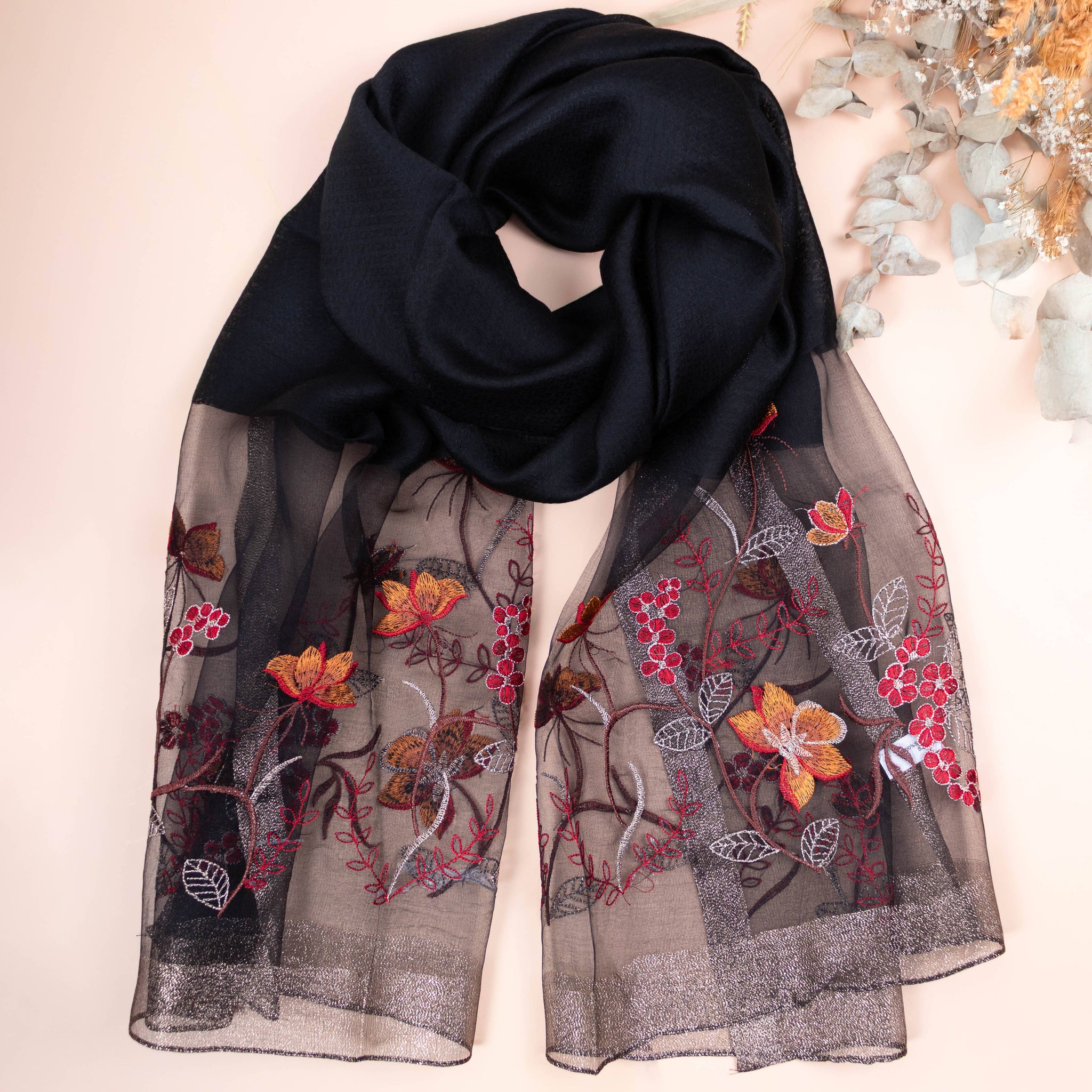 Indulge in the ethereal beauty of this exquisite silk scarf.