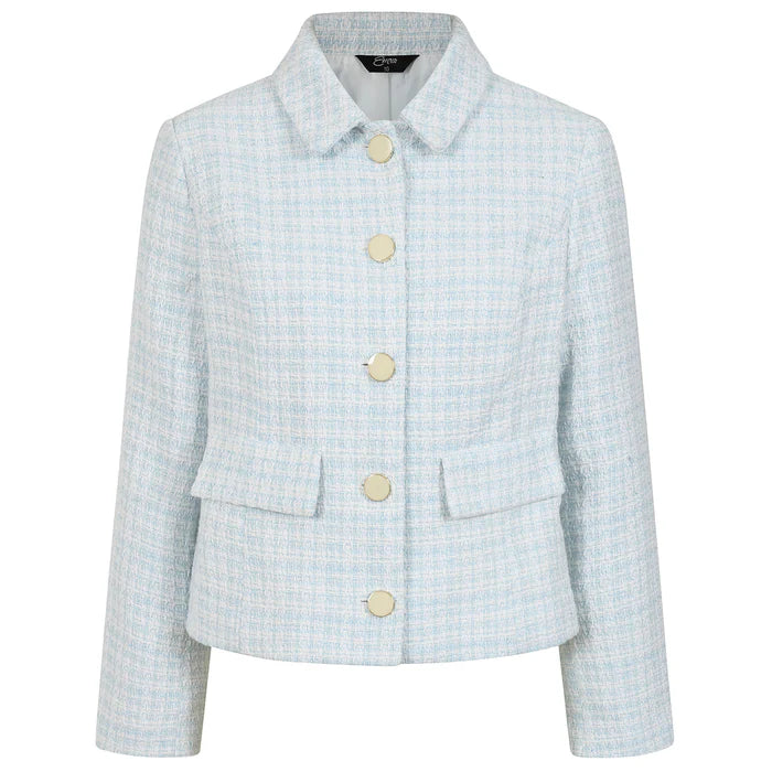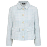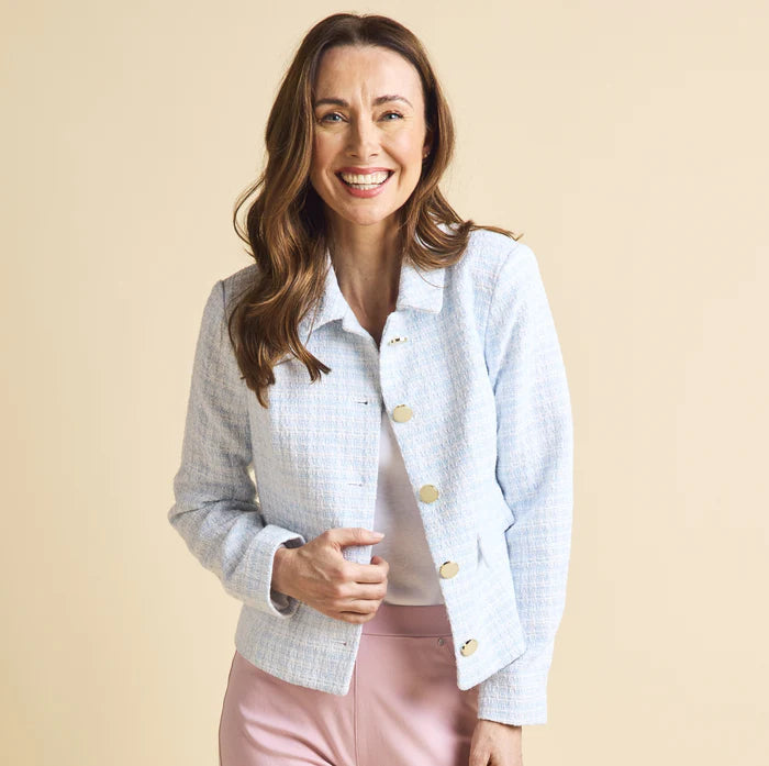 This tailored boucle jacket combines a classic texture with a modern silhouette. The boucle fabric provides a soft, textured feel with a subtle blend of blue & white threads creating an elegant woven pattern. The cropped design sits just above the hip offering a flattering fit which can look great worn with trousers or dresses. Finished with chic metallic button and pocket detail, this jacket can be dressed up for a special occasion or paired with jeans and pumps for a more casual outting.