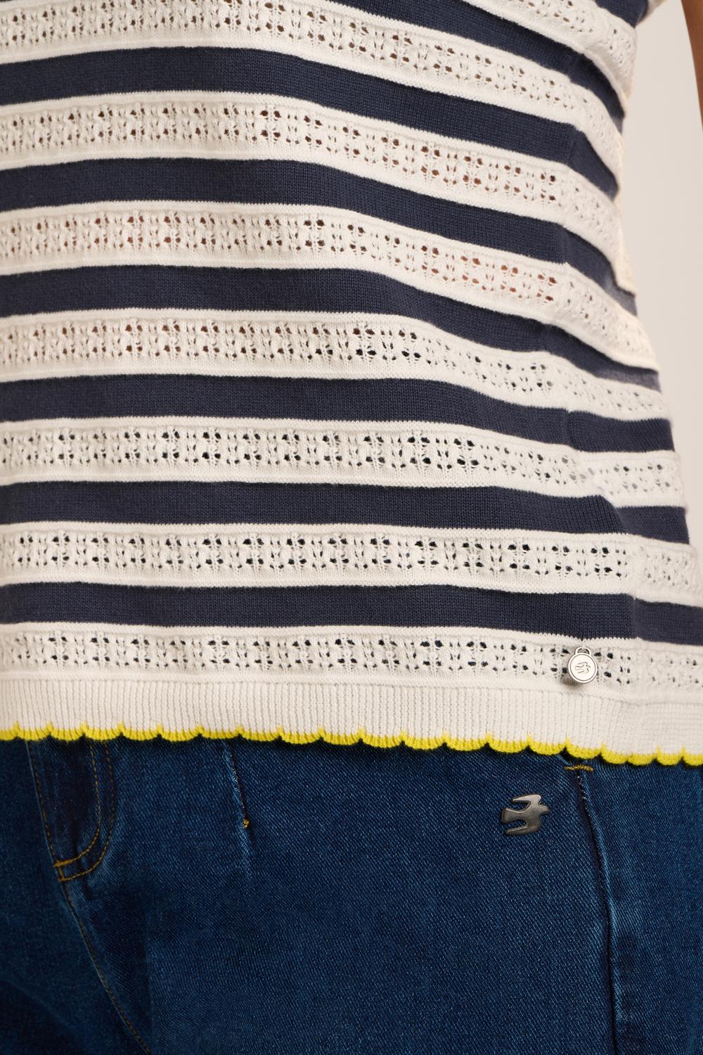 Who doesn’t love navy and white stripes? Our Wistlara vest brings classic style with a modern touch. Crafted in a lightweight textured knit, it features an easy, relaxed fit and a bright yellow tipping along the scallop neckline and hem. The perfect piece to add a subtle pop of style to your everyday outfits.