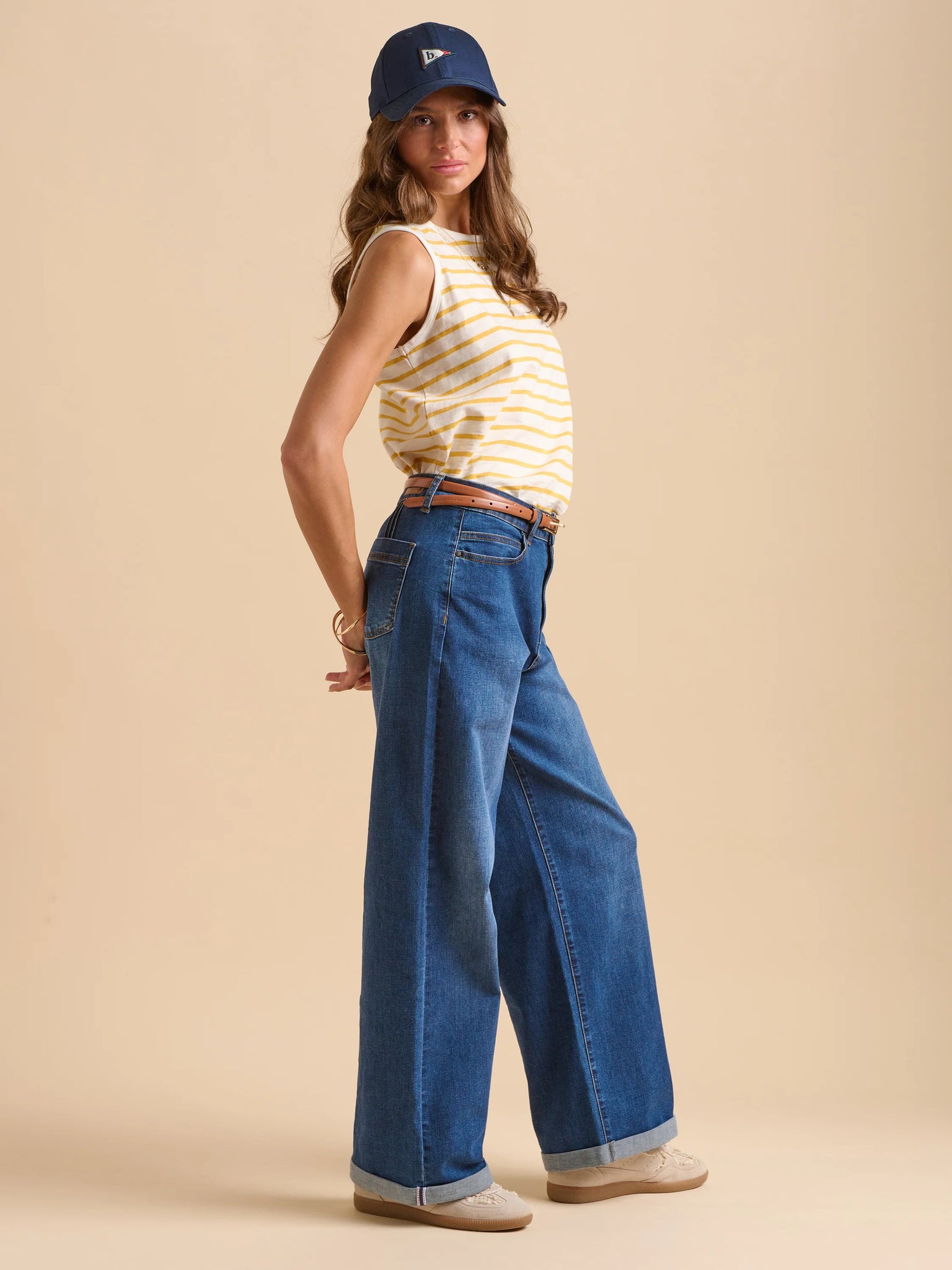 It’s time to get dressed for a clifftop adventure with friends - this white and yellow striped top is the perfect companion. With its sporty crew neck and sleeveless design, it’s soft, comfy, and made for those hot days in the sun.