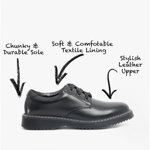 The Impact chunky lace-up shoe for senior girls is designed to provide exceptional comfort and support from the first bell to the last. Crafted from durable black leather, these shoes feature a robust, chunky sole built to handle the demands of all-day wear. The soft padded collar offers extra comfort and enhanced ankle support, ensuring a snug fit throughout the day. Inside, the breathable lining keeps feet fresh and dry, making these Angry Angels shoes the perfect combination of style, durability, and comfort for active, busy feet.