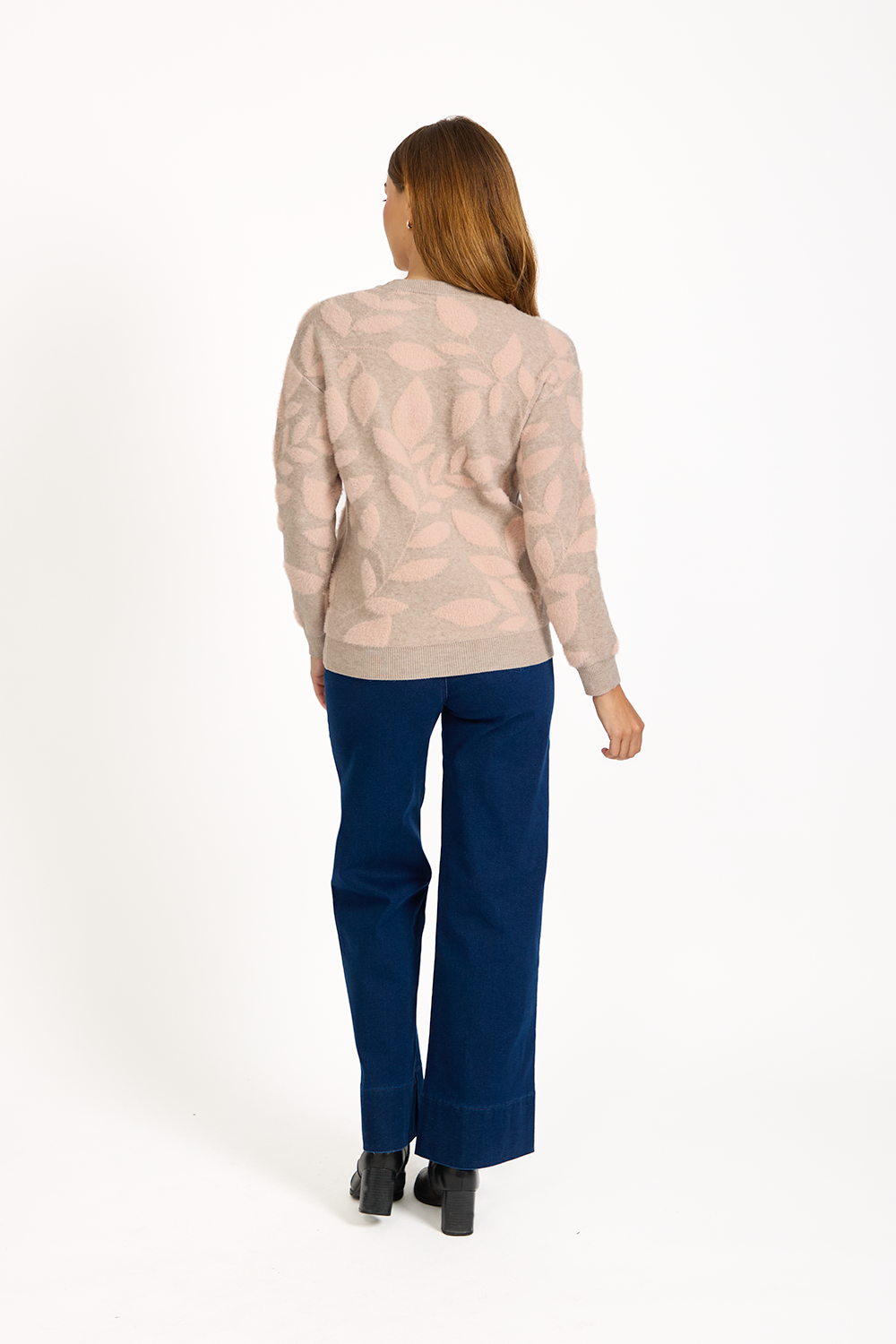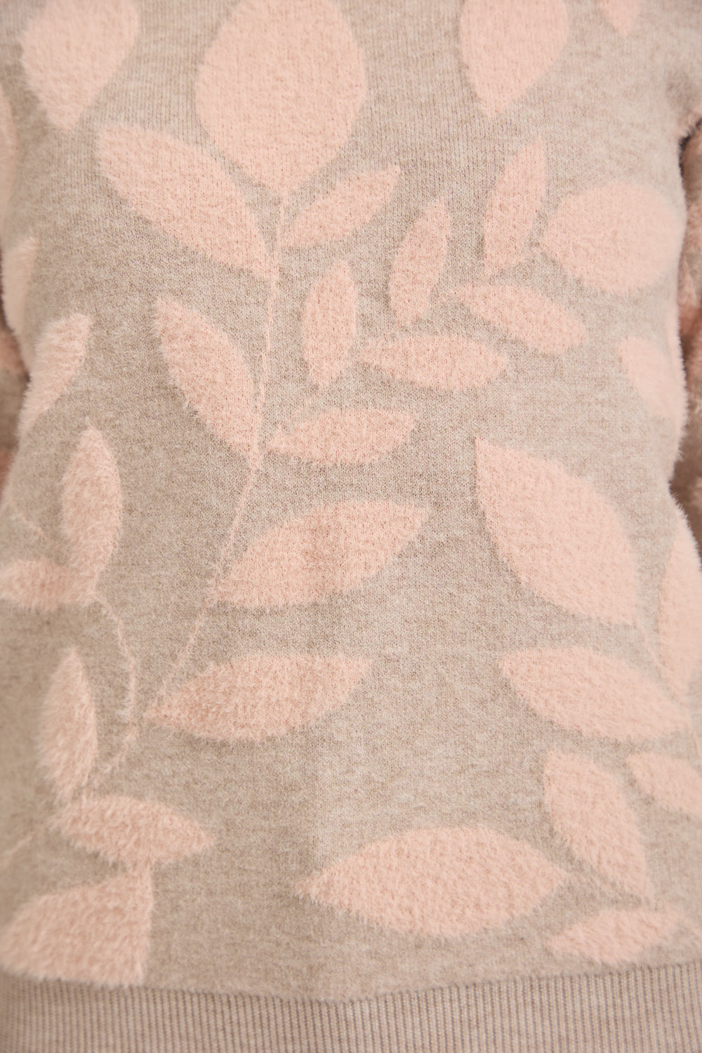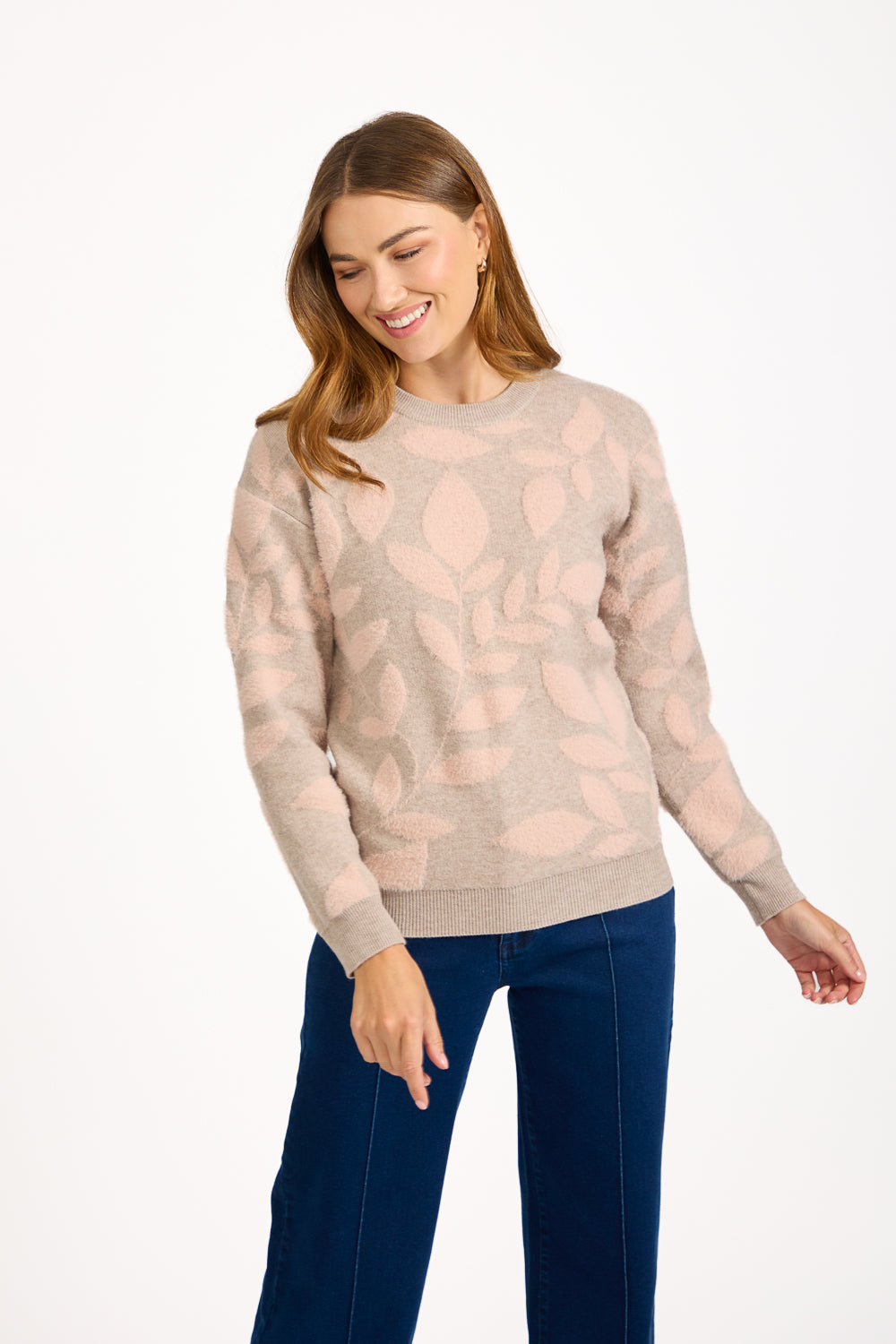 MUDFLOWER Beige Leaf Print Fluffy Yarn Jumper