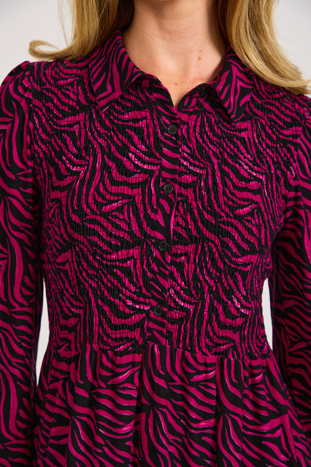 Our Zebra Print Soft Touch Shirred Bodice Button-Up Midi Dress is designed with a zebra pattern that adds a lively touch to your wardrobe, whilst the soft-touch fabric ensures all-day comfort. The dress falls to a midi-length, and is designed with a shirred button-up bodice offering a flattering silhouette that’s suitable for both casual and more formal occasions. With its practical pockets, this dress makes a perfect addition to any wardrobe.